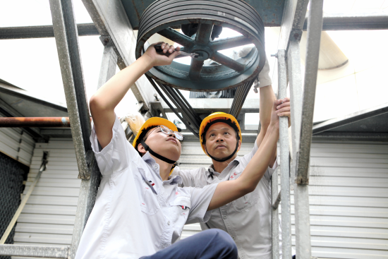圖為該廠動力車間設備維修工指導徒弟處理真空泵冷卻塔故障