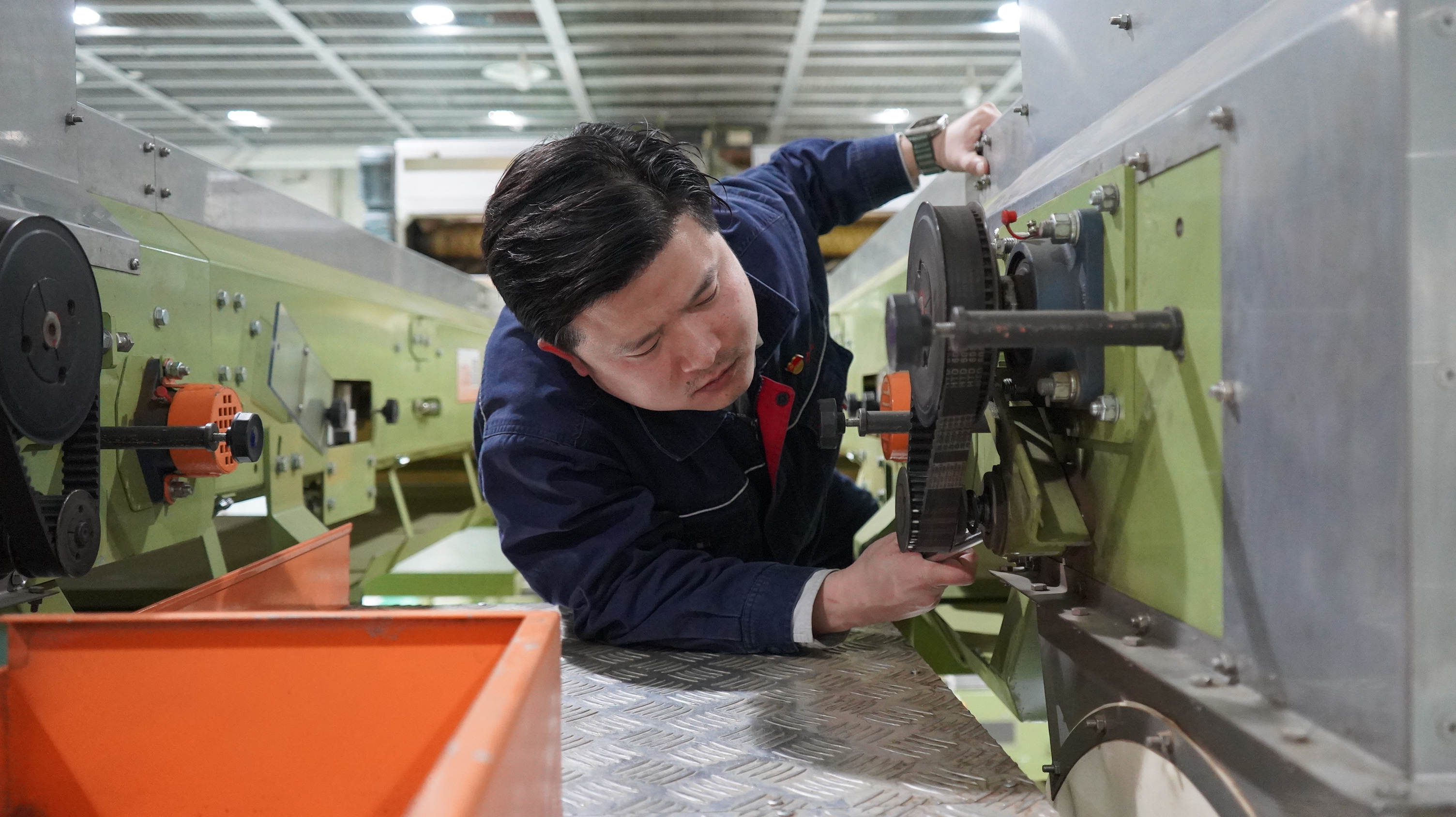 為保障設(shè)備生產(chǎn)運(yùn)行穩(wěn)定,近日,江西中煙工業(yè)有限責(zé)任公司南昌卷煙廠制絲車間開展設(shè)備檢修工作。制絲車間全體員工迅速投入到緊張忙碌的設(shè)備檢修工作中,為穩(wěn)定產(chǎn)品質(zhì)量打下堅(jiān)實(shí)基礎(chǔ)。圖為維修工對(duì)皮帶機(jī)帶輪進(jìn)行維保。